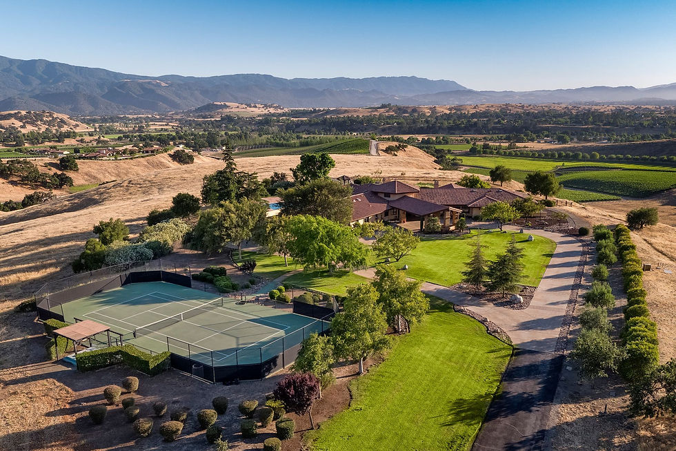 The spacious master suite and bath features a work-out room and additional bath located in a separate wing of the house. Boot and spur friendly Saltillo tile is used throughout the home and is particularly popular for pet lovers. From the salt water pool, just beyond the kitchen and living areas, the surrounding vineyards, Thoroughbred Farms and mountains can be seen in the distance including a mature grove of organic olive trees historically producing a lovely quality oil. With a high entertainment value, the residential improvements include a recently resurfaced tennis court, large irrigated pastures for horses including approx.