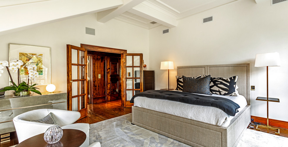 Warmth and elegance continue into the home itself, where the hand-finished Koa wood fromHawaii, often considered second to none by woodworkers and dealers for its spectacular appearance, makes an immediate impression. The Koa runs throughout the home, bringing vibrancy to walls, ceilings, doors, floors, and trim. It’s contrasted against Mexican light limestone and other earth tones that exist in surrounding elements throughout the home.A south-facing kitchen overlooks the expansive black-granite patio, complete with classic elements, custom Koa cabinetry, three-inch-thick granite countertops, and professional stainless-steel appliances, as well as an eat-in bar. An elegant dining room is just steps away, large enough to service the whole family for a holiday dinner and perched up, overlooking Forest Road and the surrounding landscape.The stunning great room is the property’s signature living space, spanning the full width of the home with round-arch windows on either side of the room. Signature Koa woodwork lines the walls and ceiling, while a 16th Century stone fireplace provides dramatic contrast against the custom woodwork in this grand living area, which features a wet bar for entertaining. Perched among the pines, the bright master suite is accessed by the magnificent, hand crafted spiral staircase or elevator.