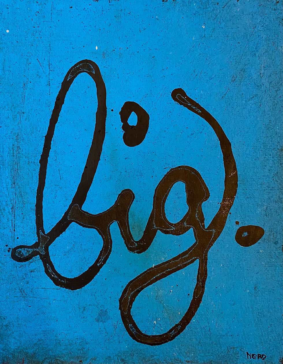 At the conceptual center of my practice is BIG., created in 2019. BIG. operates as a contemporary cultural sign, inheriting the logic of generational images such as the 1960s smiley face while reconfiguring it for a post-digital condition defined by distraction and image saturation. Its formal economy, legibility, repetition, and seriality enables circulation across contexts, yet its restraint redirects these mechanisms toward attention, faith, and interior structure. Positioned at the intersection of post-minimal seriality and conceptual practice, the work enacts reduction as both a critical strategy and a moral framework, privileging presence over consumption. The original image adopts the proportions of a cell phone, the defining object of our era, simultaneously connecting and distracting us. At its center appears a single word: Big. The typography references early forms of lettering legible to both humans and machines, subtly bridging antiquity and digital futurism. BIG. functions as an interruption. It asks the viewer to disengage from constant stimulation and re-enter physical presence.