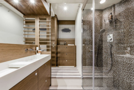 The craft’s standard layout includes 3 cabins (a Master Cabin, a full beam VIP cabin and a guest cabin with side-by-side twin beds) and 3 bathrooms, as well as a twin crew cabin with its own bathroom. In this initial layout the dinette is remarkably spacious and owners can even choose to include a bar and a 40-inch TV, two ideal features for enhancing still further the craft’s propensity for socializing.