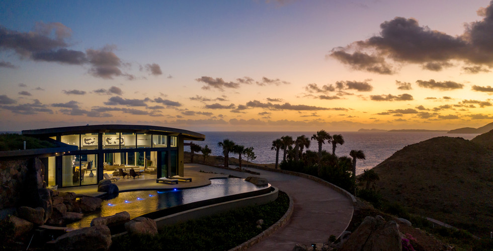 Both curved and flat rooflines follow the rise and fall of the landscape and a remarkable 7,450 square foot green roof brims with native flora enhancing the villa’s seamless integration into the island’s topography. Lion Heart’s elevated cliffside position offers unrivaled 270 degree panoramic views of the sea, resort and neighboring islands - including Necker and Anegada - as well as sweeping views of the entire coastline of Virgin Gorda. The approach to Lion Heart is marked by an impeccable stonewalled drive that emerges out of the natural terrain. Once inside the villas, unique architecture and immaculate design ensure that interior and exterior spaces blend seamlessly together.