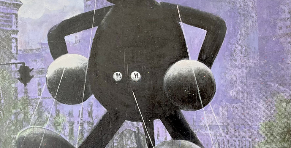Helander has had a particular interest in documenting moments in American history with his own historic slant, such as the topping off of the Statue of Liberty, Mount Rushmore under scaffolding, or the exciting debut of a gigantic helium-filled balloon in the shape of the original Mickey Mouse for the 1934 Macy’s Thanksgiving Day Parade. He enjoys combining narrative abstraction, fragments of vintage advertisements, color harmony, cartoons, compositional juxtaposition and interpretive landscapes.