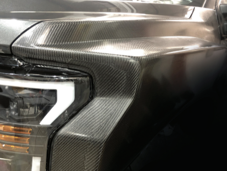 A carbon fiber hood scoop and grille complete the aggressive look that everyone desires in a SuperTruck. Why Carbon Fiber? When Carbon Fiber is mixed with the correct epoxy resins, it is many times stronger than metal. Not only is Carbon Fiber stronger than metal and fiberglass, it’s also incredibly light. This is why manufacturers of everything from airplanes to boats are embracing carbon fiber over metal or fiberglass alternatives. We chose this superior fabrication method for all Sintor’s uniquely designed body panels.